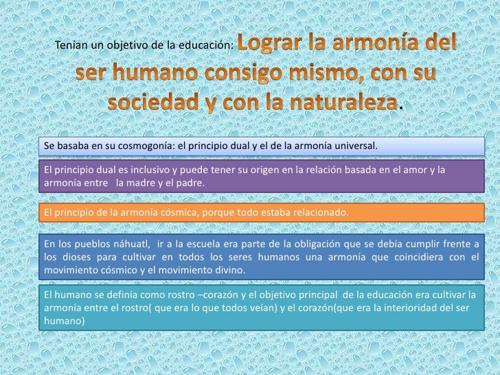 La educación azteca fue un sistema educativo institucional que iba desde el pre-escolar hasta la educación superior. El códice mendocino explica que los padres debían educar a sus hijos desde que nacían hasta los 13 años. Se les enseñaban a hablar, bañarse y cuidarse para ser